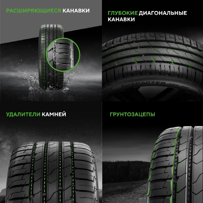 Ikon Character Aqua SUV — надежные и универсальные летние шины для широких условий эксплуатации: город, трасса, плохие дороги и легкое бездорожье. Обеспечивают контроль и комфортное управление при любой погоде.