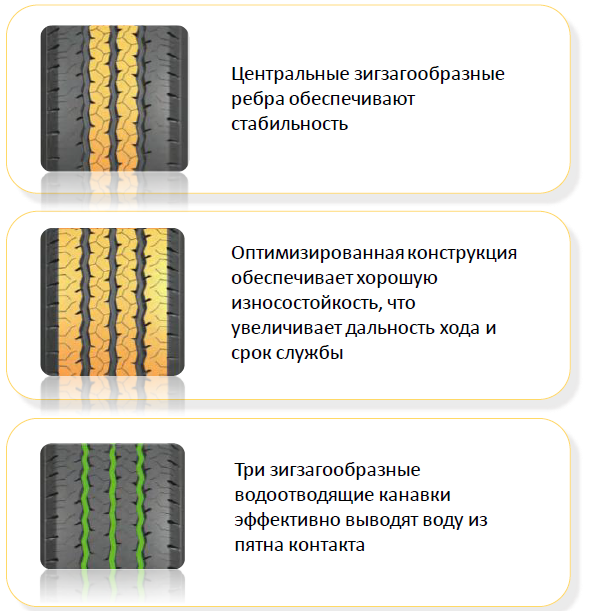 - Благодаря оптимальному дизайну вода и грязь быстро удаляются из протектора, предотвращая возможное аквапланирование;