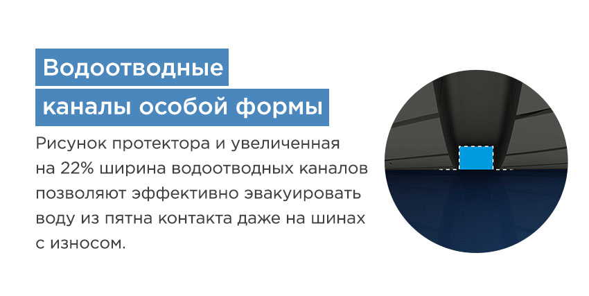 Уникальный профиль этих канавок позволяет быстро и качественно отводить воду из пятна контакта вне зависимости от степени износа протектора, тем самым поддерживая отличное сцепление с мокрой дорогой.
