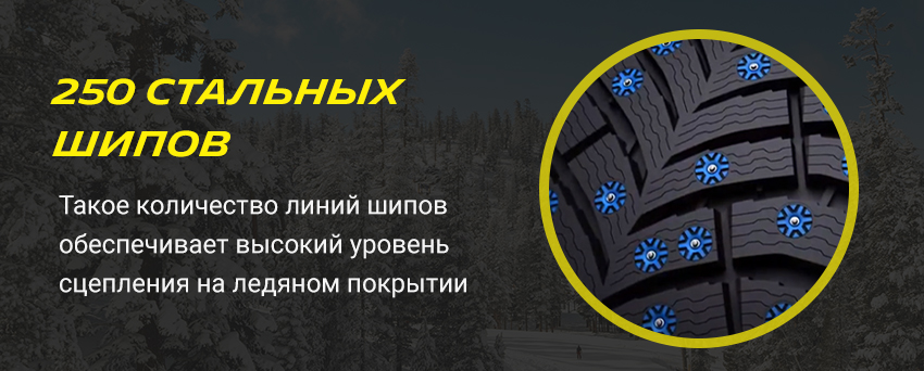 Шина имеет рекордное количество шипов (более 250 штук в 16 диаметре), что обуславливает высокий уровень комфорта и безопасности при движении по укатанному снегу и в гололед.